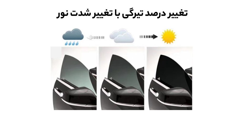- درصد تیرگی این شیشهها به شدت نور بستگی دارد یعنی با افزایش نور، تیرگی بیشتر و با کاهش نور، تیرگی کمتر میشود.